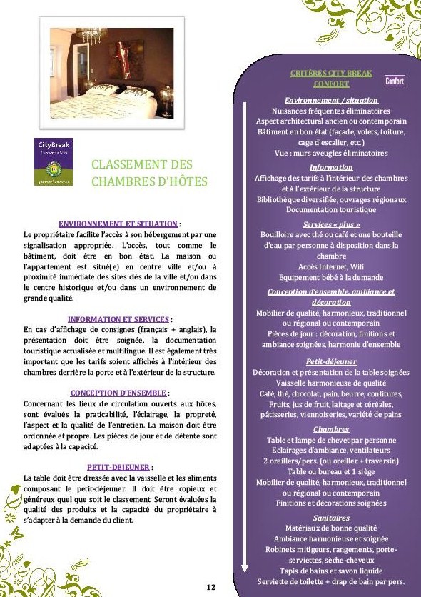 Voici les critères pour la première catégorie CITY BREAK CONFORT :